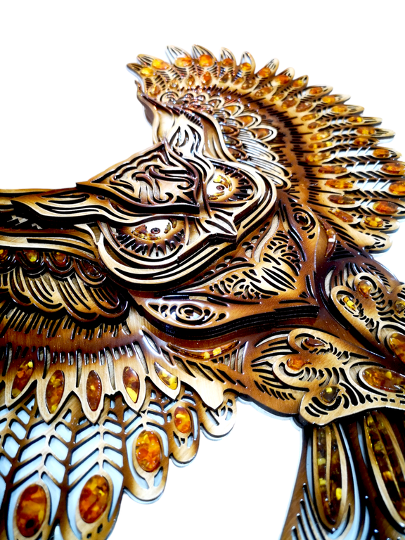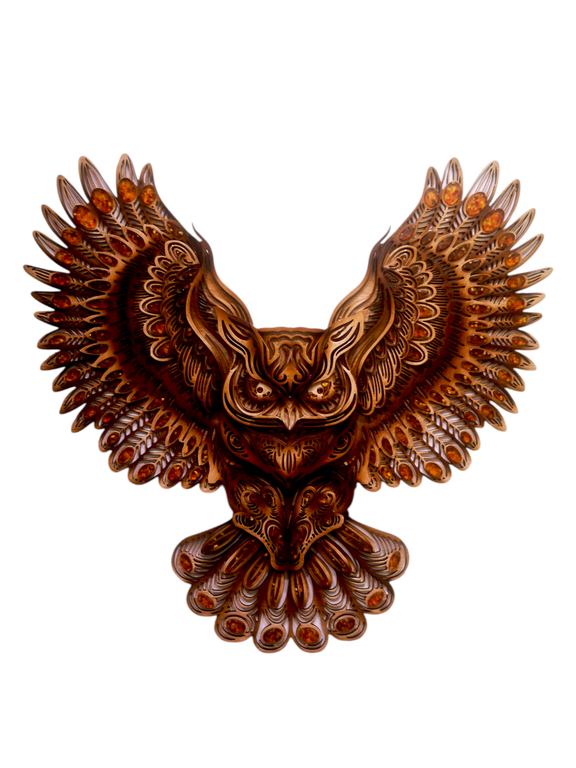 Панно "Сова". Выполнена методом контурной мозаики, на деревянной основе, вставка янтарь. Размер панно 48 х 48 см.