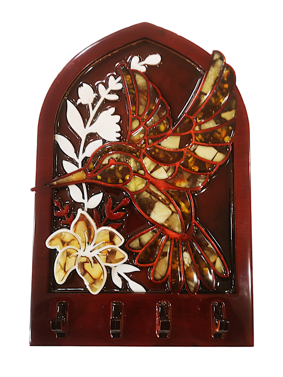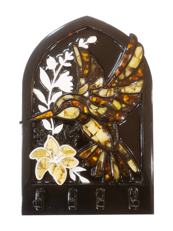 Декоративная ключница "Колибри". Композиция с элементами янтарной мозаики имеет 4 подвеса. Габариты 22,5 * 15 см.